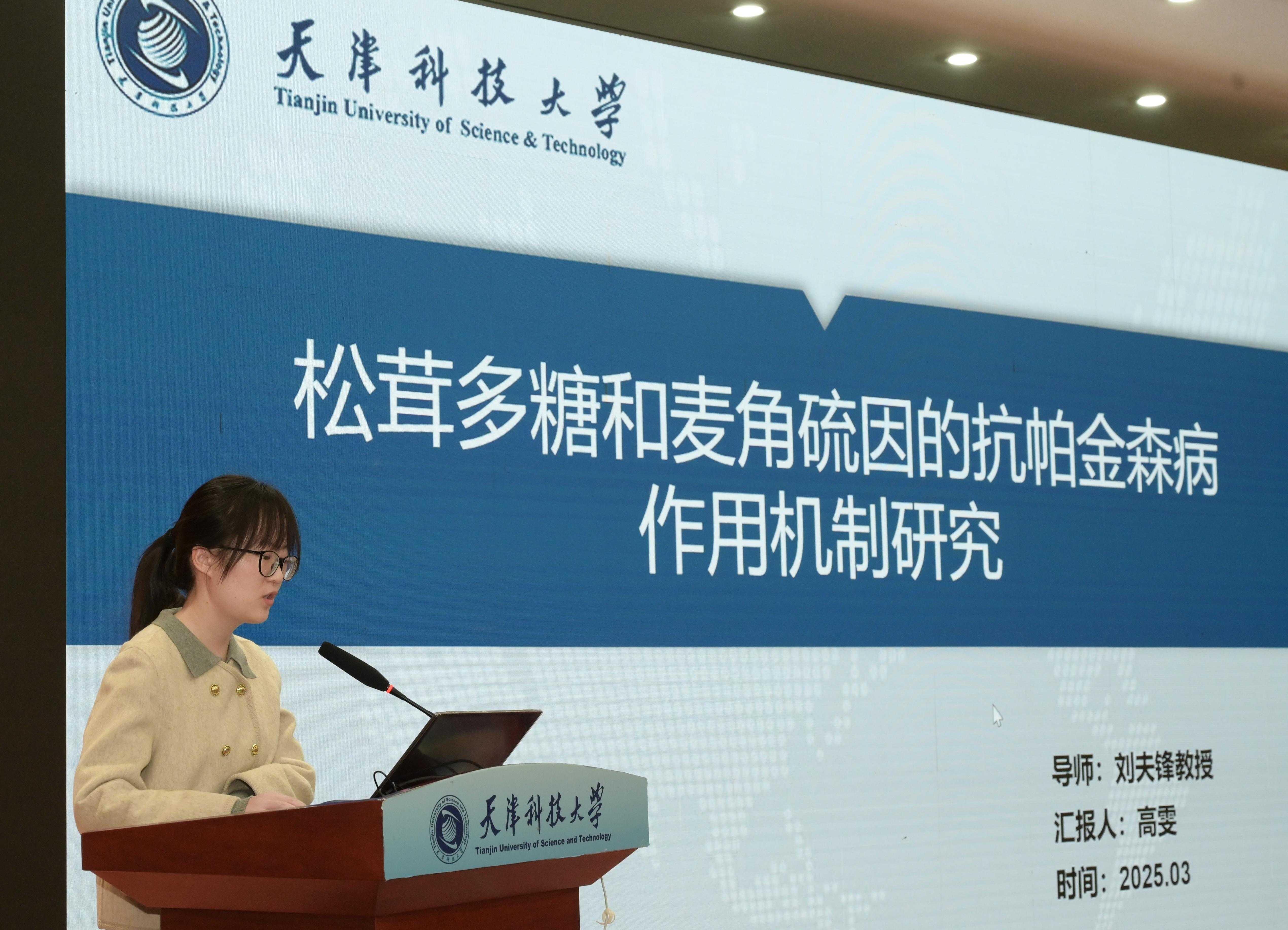 论坛由三名博士研究生和五名硕士研究生进行汇报。博士生高雯系统地揭示了松茸活性成分抗帕金森病的双重作用机制,为神经退行性疾病干预开辟新路径;博士生李俊众构建并优化了乳糖生物传感器,实现了乳酰-N-新四糖(LNnT)合成关键酶的高通量筛选。博士生宋兆霖运用酶分子工程策略,以丝氨酸和S-烯丙基-L-半胱氨酸为底物合成了蒜氨酸,显著提高了蒜氨酸的合成催化效率。五位硕士生的汇报从漆酶固定化技术创新到双酶共展示系统构建,从益生菌胞外囊泡医疗应用到发酵代谢调控解析,以及通过对胰脏多肽抗炎机制解析来开发慢性炎症治疗产品。报告涵盖了生物制造、医疗健康、食品工程等领域。