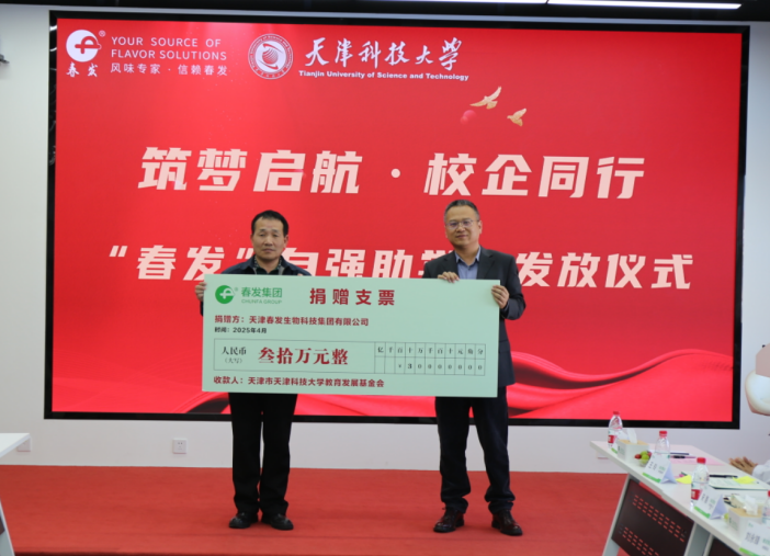校友与基金事务发展中心李忠德代表学校接受捐赠并讲话。李忠德表示,多年来天津春发生物科技集团有限公司以“春发”自强助学金形式资助了百余名科大学子顺利完成学业,充分展现了校友企业的社会责任感和爱校荣校情怀。未来学校将与公司进一步深化合作交流,期待充分发挥彼此的资源优势,在“复合型人才定向培养”“关键技术攻关”“资源共享平台建设”等领域找到更多契合点,构建互利共赢新生态。