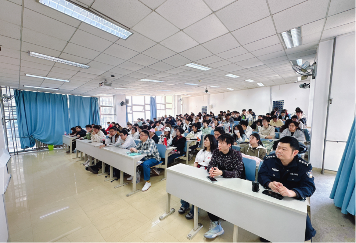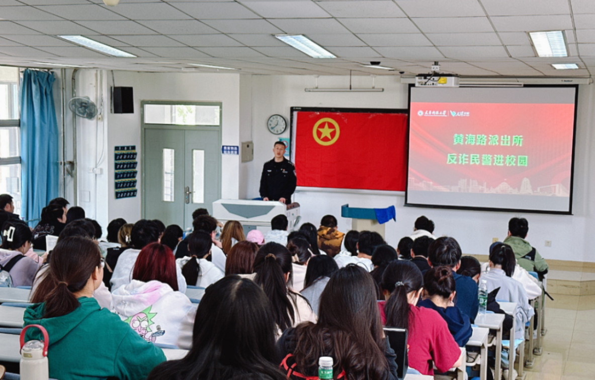 邀请黄海路派出所民警刘警官以校园频发的诈骗案例为切入点,深度剖析“刷单返利”、“虚假购物”、“伪装客服”、“游戏诈骗”和“抖音直播带货”等骗局,通过情景模拟还原诈骗话术与作案流程,现场教学正确使用国家反诈中心APP预警功能,强化“不轻信、不点击、不转账”的防范意识。同时,刘警官还就校园非机动车丢失、贵重电子产品占座遗失等案例,提醒同学们规范文明存放车辆,强化同学的财产保护意识。