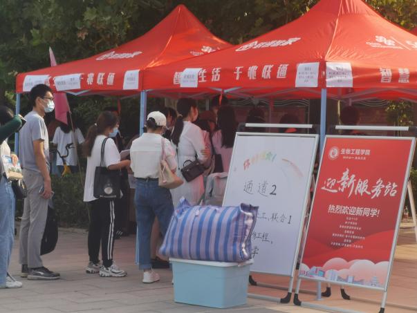 迎新志愿者的身影便活跃在滨海站迎新接待点,为2022级新生第一时间送去学校暖心的接站服务。志愿者们高举醒目的接待牌,坚守在各个出站口,进行乘车登记、体温筛查、入校码扫描等手续,帮助新生搬运行李、解答疑惑……从车站到学校,志愿者们用耐心的态度和热情的讲解为远道而来的生物学子提供“一站式”暖心服务。