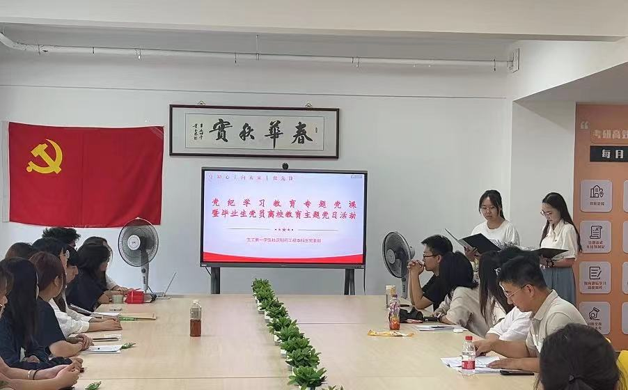 为推动党纪学习教育走深走实,引导支部毕业生党员学纪、知纪、明纪、守纪,同时为表达对毕业生党员的深切关怀和祝福,强化毕业生党员的党性修养。2024年6月14日,生工第一学生社区制药工程本科生党支部开展了以“守初心,向未来,做先锋”为主题的党日活动。支部全体党员参加,活动由党支部党员李佳莉和屈琰同志共同主持。