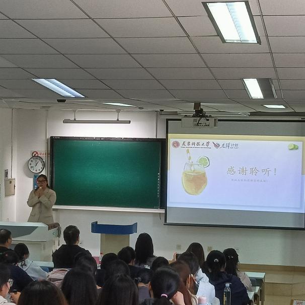第十届天津科技大学“琼糯酩香”自酿糯米酒大赛获奖团队代表程韵菲作为负责人分享了参赛经验,从团队组建、创意选取、作品命名、酿造过程、结果呈现等方面讲述了参赛经历,同步展出的往届获奖作品,以其多样化的色泽与创意构思,直观呈现了赛事的创新空间,激发同学们的探索热情。在自由提问环节,与会学生围绕“发酵条件”、“发酵时间”、“容器选择”等问题踊跃提问,都得到老师逐一耐心解答。