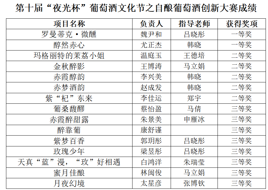 天津科技大学“夜光杯”自酿葡萄酒创新大赛已成功走过十届历程,累计有1200余支团队、4500余名同学积极参与其中。这一赛事不仅成为了学校传承与弘扬中华优秀传统文化的重要载体,也为提升大学生人文素养、培养创新精神和实践能力提供了广阔的平台。多年来,它见证了无数学生在葡萄酒文化领域的成长与探索,培养了一批又一批对葡萄酒文化充满热情的学子。相信在未来,这一赛事将继续发扬光大,不断创新和完善赛事形式与内容,吸引更多师生投身于葡萄酒文化的探索与实践。