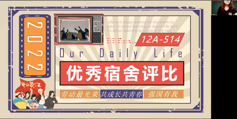 本次活动分为优秀宿舍评比和优秀宿舍长(网格员)评比两部分组成。在优秀宿舍评比环节中,各宿舍主讲人展示PPT,介绍宿舍环境和宿舍同学学习工作情况,并与观众分享了宿舍围绕“献礼二十大”、“百年团史”、“红色文化”、“科技创新”、“筑梦冬奥”、“绿色健康”、“文艺青春”、“劳动最光荣”等主题进行的文化布置。在优秀宿舍长(网格员)评比环节中,宿舍长们分别从个人介绍,宿舍工作,未来展望等方面介绍了自己,宿舍长们以身作则,不仅带动宿舍成员们勤勉刻苦,助力宿舍成员多方面发展,也团结同学,构建了良好的学习生活环境,赢得了评委老师的一致赞赏。