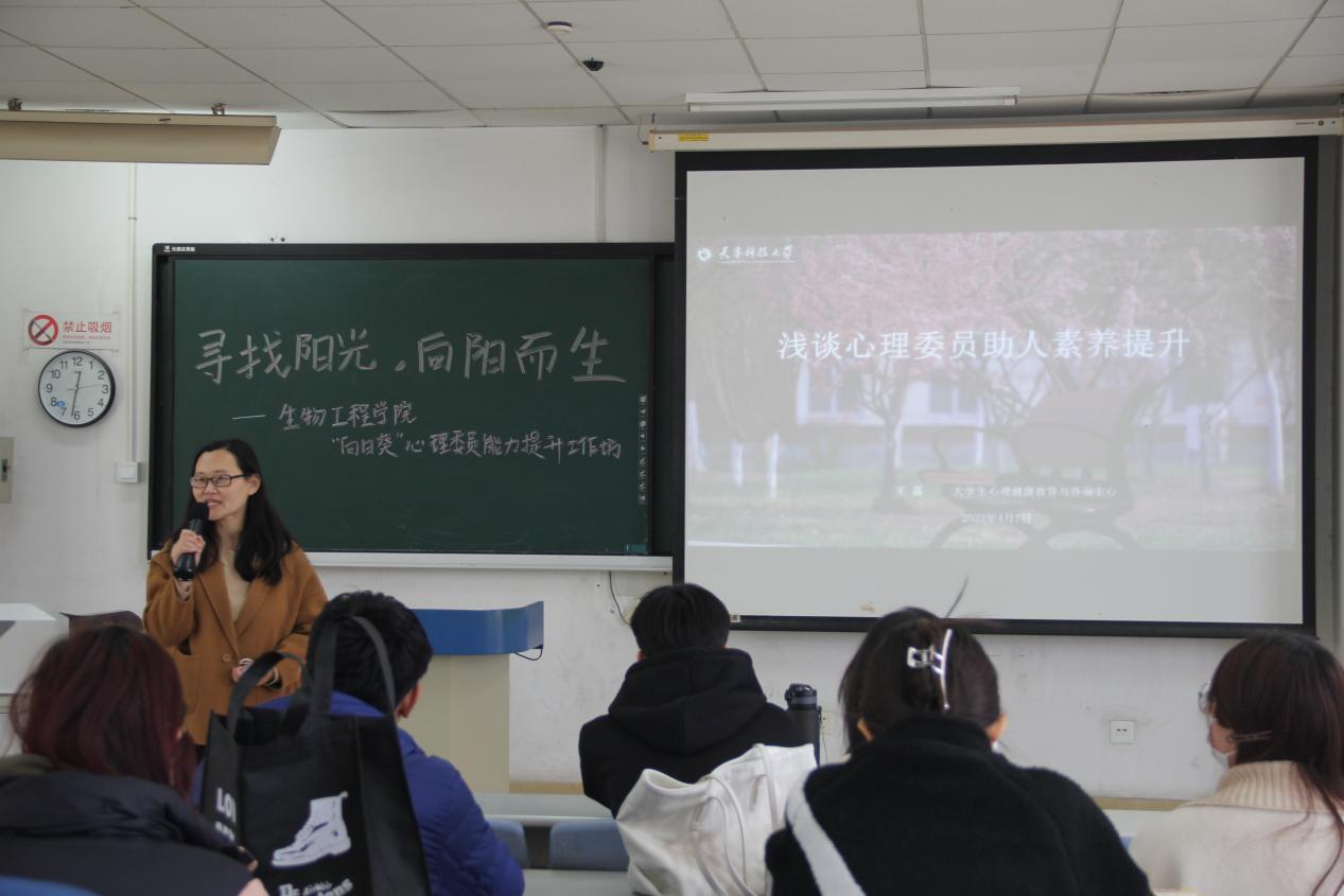 于滨海中校区3号楼209教室举行了以“浅谈心理委员的助人素养提升”为主题的心理委员能力提升培训讲座,学校大学生心理健康教育与咨询中心王荔老师受邀主讲,小九直播足球
