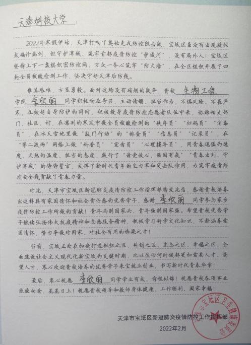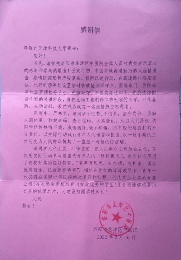 近日,宝坻区疫情防控指挥部、洛阳市孟津区中医院向我校发来感谢信,信中对小九直播足球