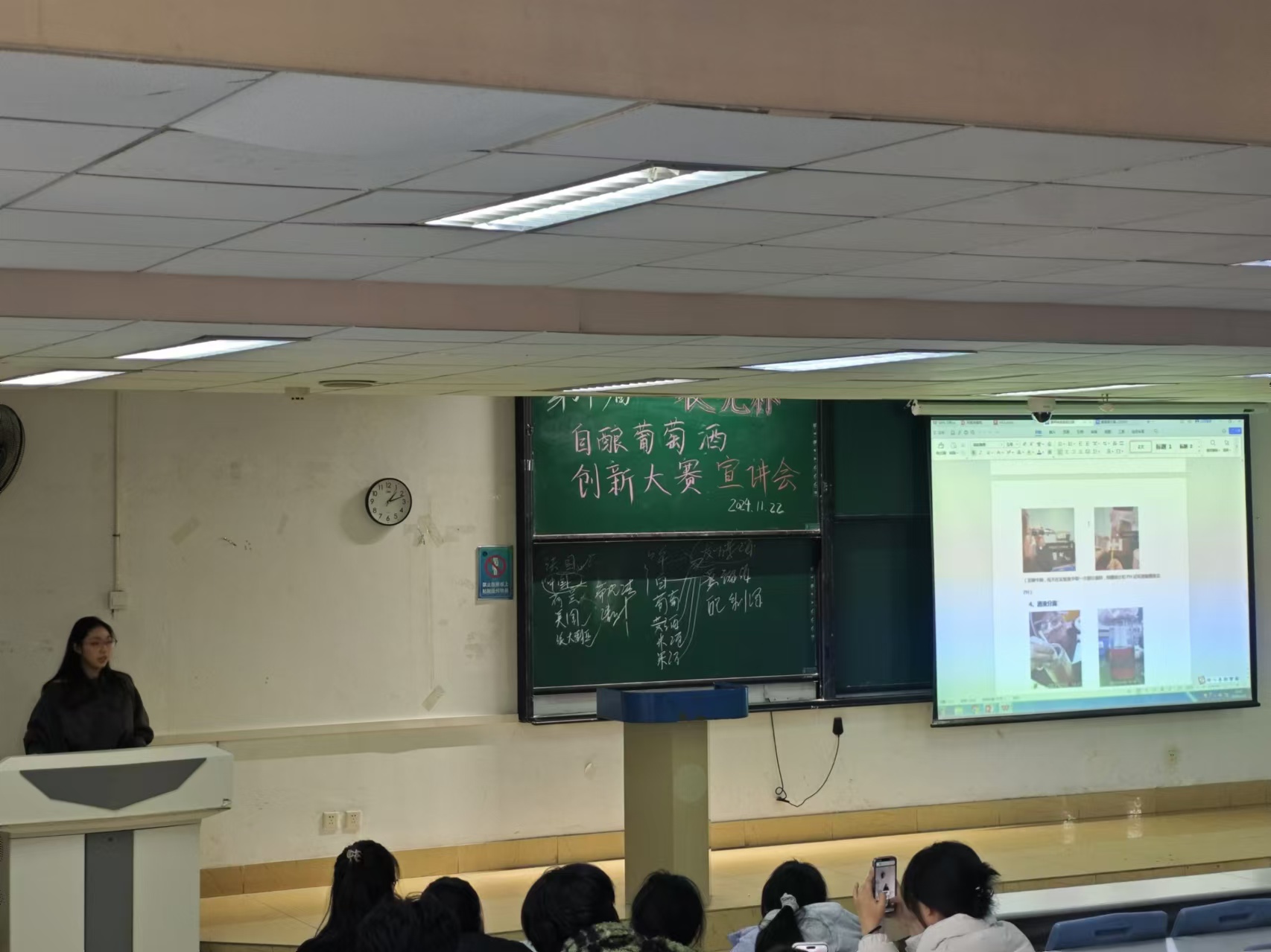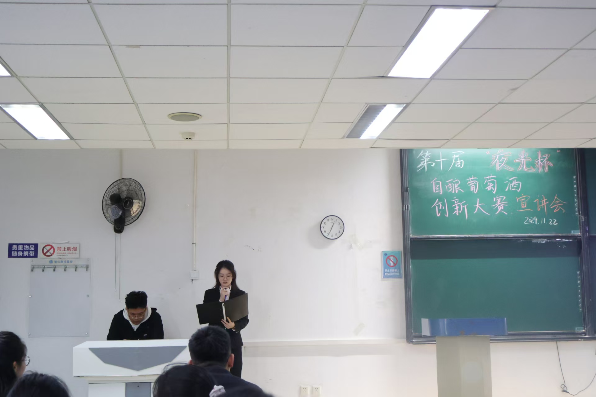 专业教师韩晓为现场同学带来别开生面、充满惊喜的葡萄酒文化与品鉴宣讲。韩老师以深入浅出的方式为同学们深入剖析了葡萄酒的历史文化脉络、复杂精妙的酿造工艺以及极具艺术感的品鉴技巧。更为精彩的是,韩老师现场开启了一瓶葡萄酒,为学生们现场讲解分享。同学们仿若置身于一个充满魅力与奥秘的葡萄酒世界,沉浸其中,不时地提出问题,与老师积极互动,现场气氛热烈似火。